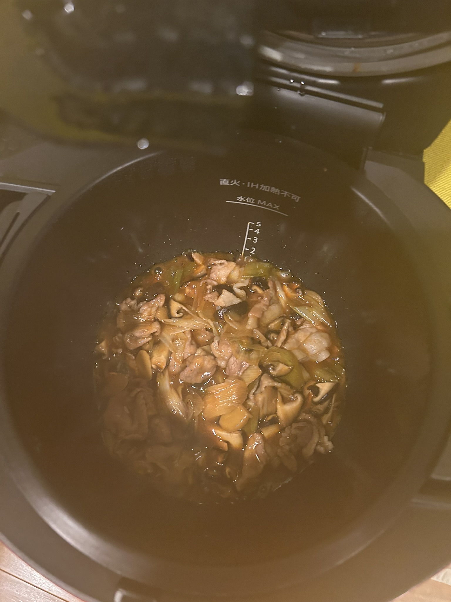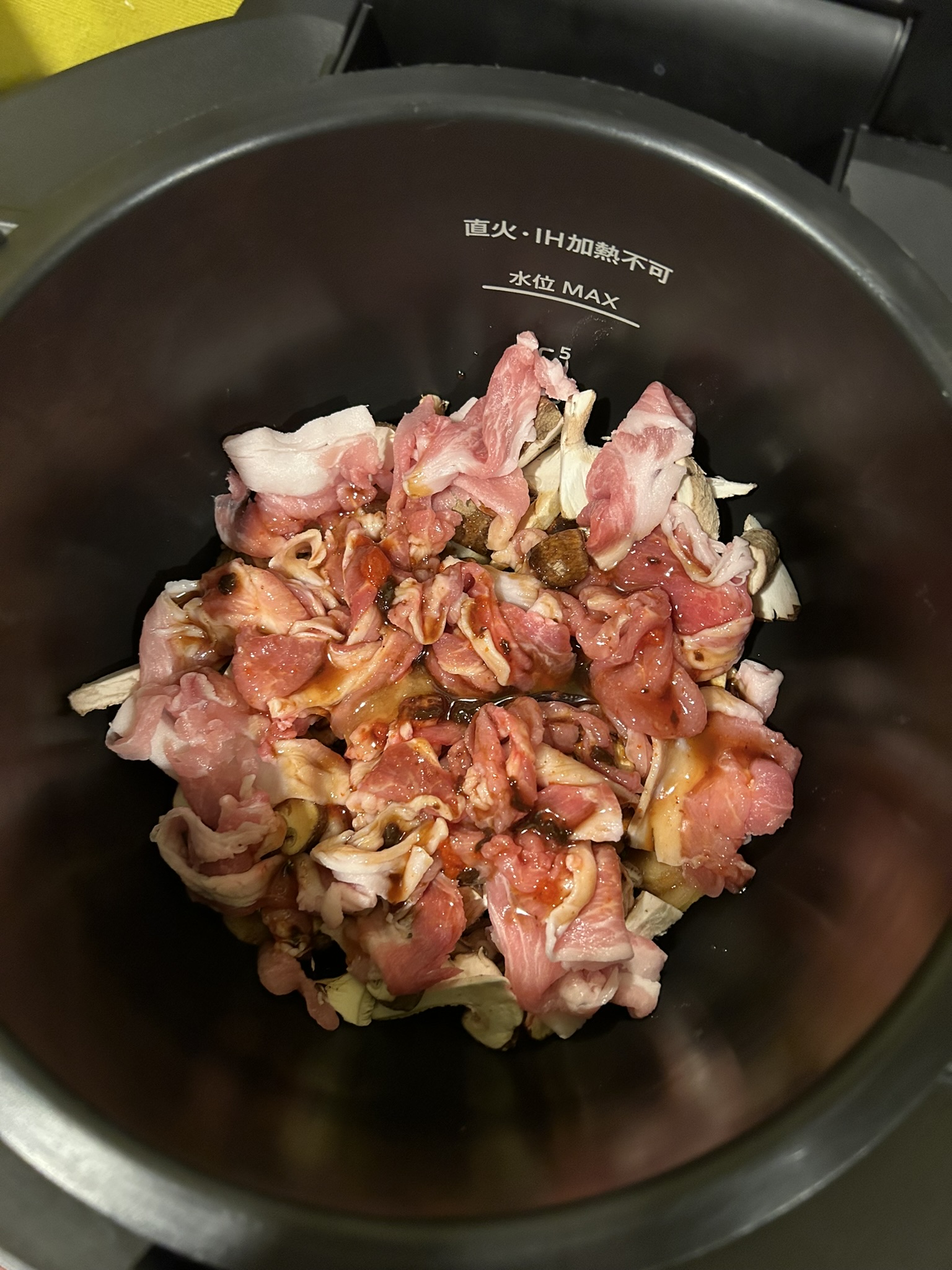ホットクックの内鍋、冷凍のネギをほぐして入れ、次に椎茸、冷凍のショウガ、最後に豚肉をほぐしながら入れます。