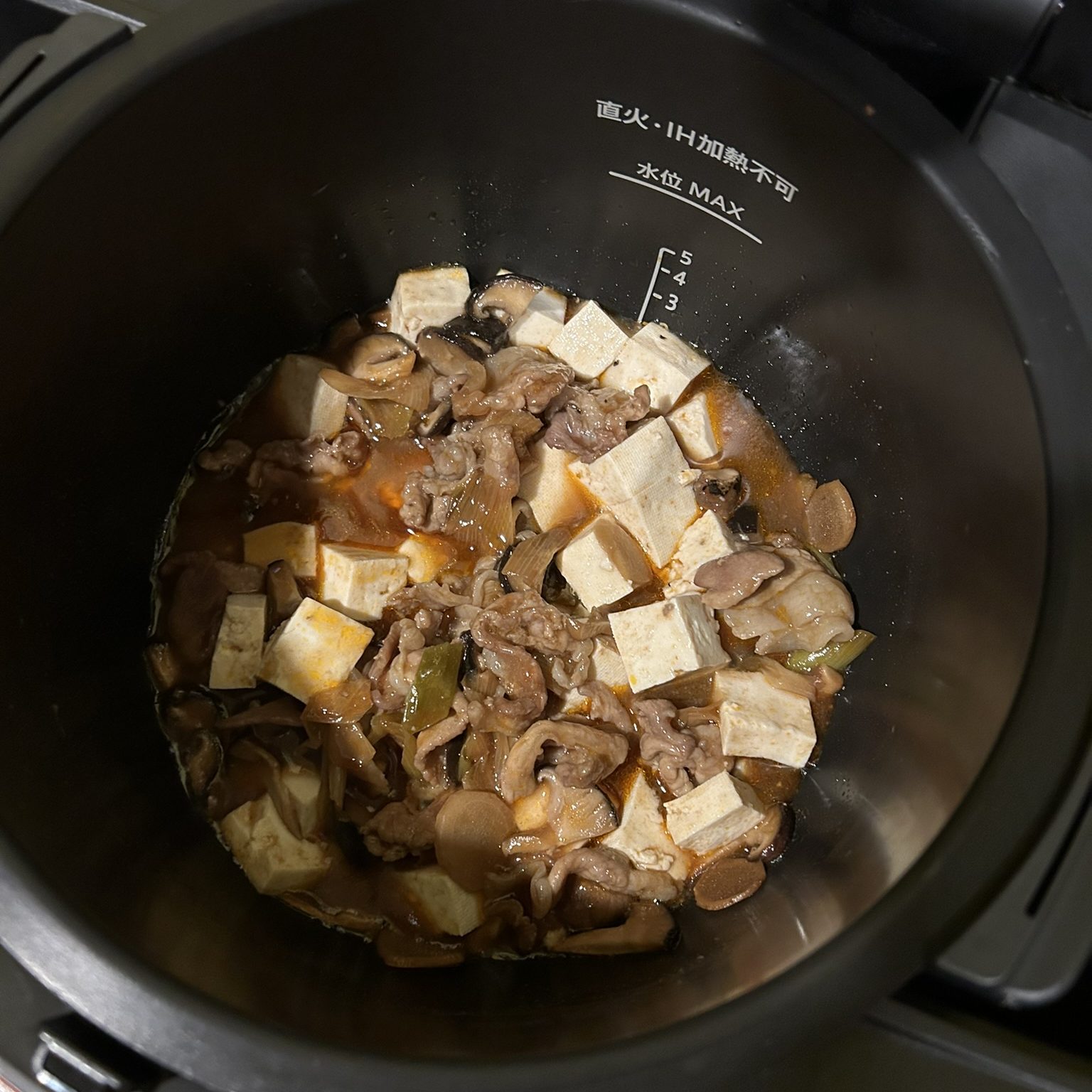 次に調味料を全部まぜたものをかけ、この豆腐以外を内鍋にいれたものをホットクック本体にセットします。