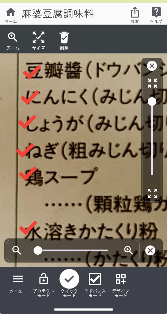 下の例は調味料の部分を撮影したものにチェックしたものです。チェックはタップすることで赤いチェックマークがつくので簡単です。