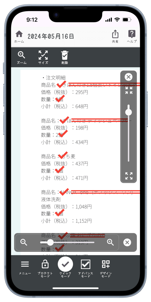 おてがるキャットで読み込んだら、後は確認した品物をタップしてチェックマークを付けるだけです。品数もチェックしましょうね。