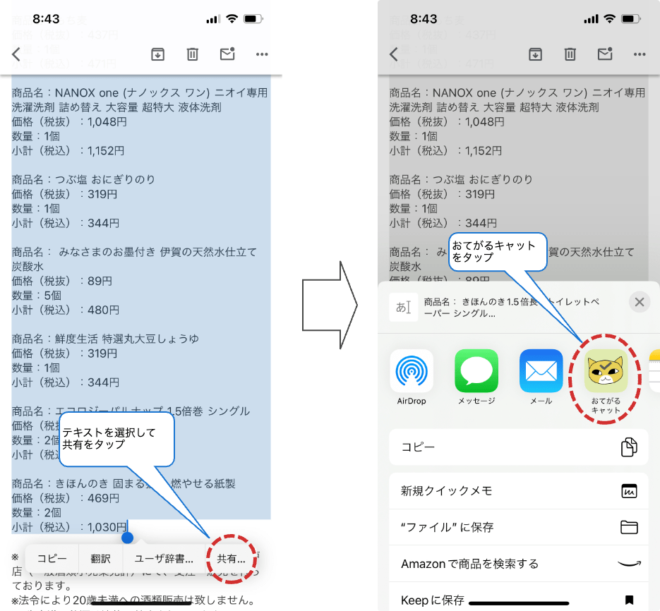 メールの内容を選択しておてがるキャットに共有!