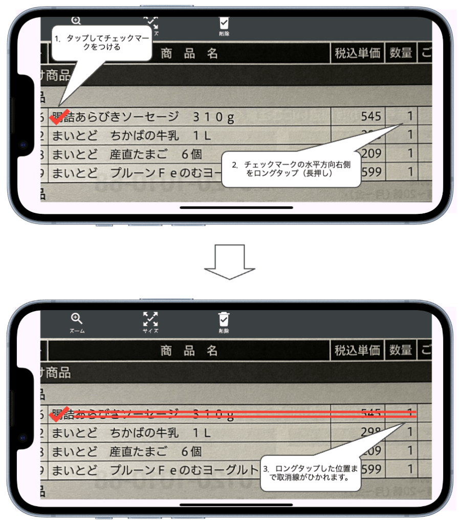 確認した商品名をタップしてチェックマークを付けましょう。チェックマークの水平方向右側をロングタップすると取消線が引けます。今回の例で言えば、名前部分をタップしてチェックマークを付けた後、数量の数字の部分をロングタップするとロングタップした位置まで取消線が引けます。