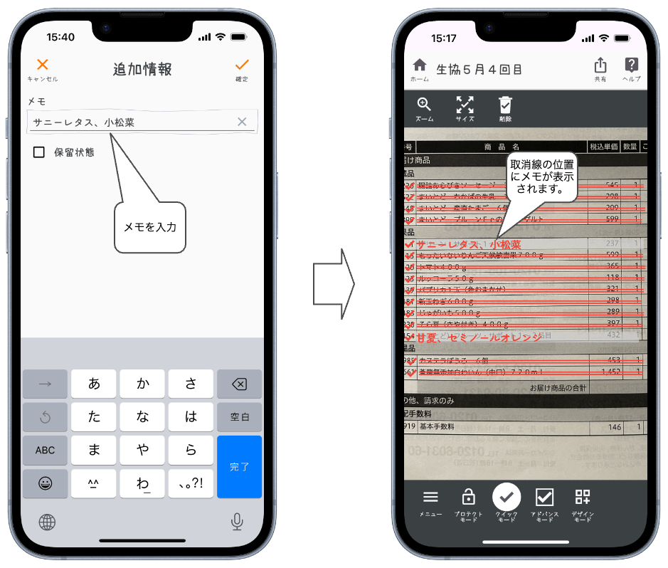 週に一度、「生協」を利用しています。配達の際、納品書兼請求書(印刷物)も一緒に渡してくれます。今までは、納品書兼請求書に直接ペンでチェックマークを書き込んで品物とその品数が注文通りかを確認していました。