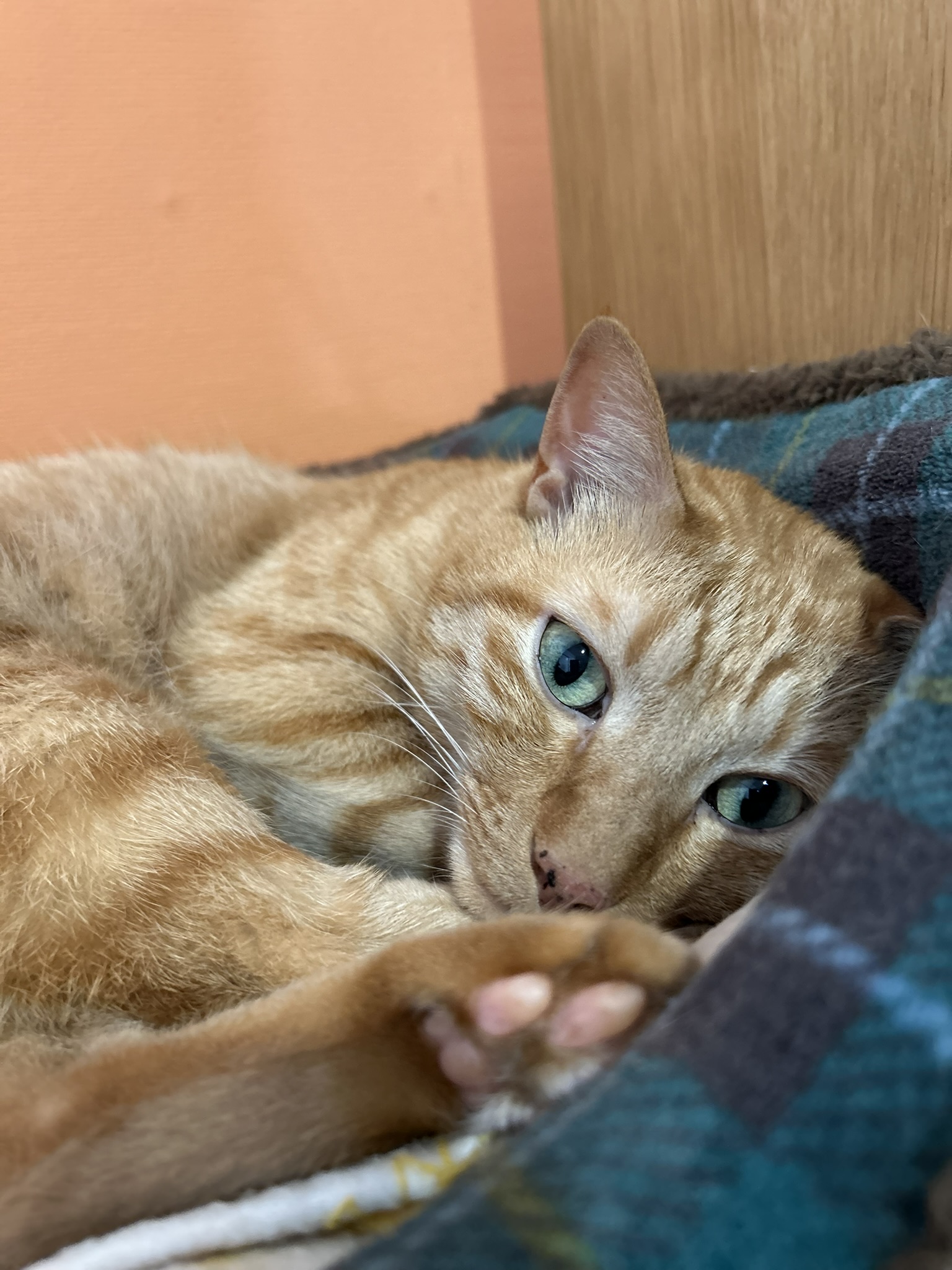 ここで、「なんだ、カメラか」とまた寝てくれればよいのですが、トラきちは寝顔を見せるのはキライらしく、目をぱっちり開けて起きてしまいます。こんな時、もうちょっと気を許してくれればいいのにと思います。