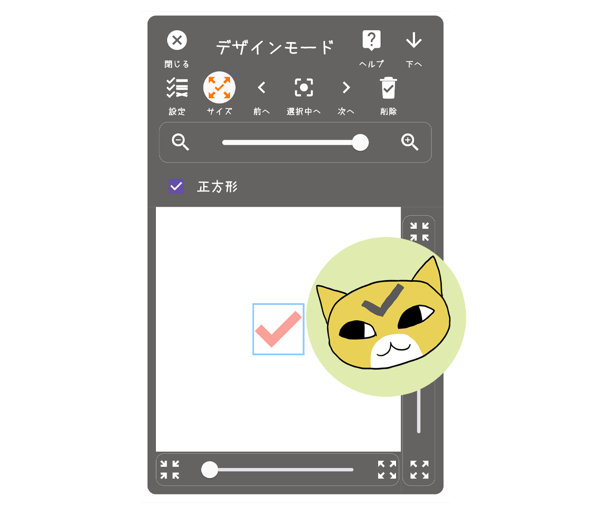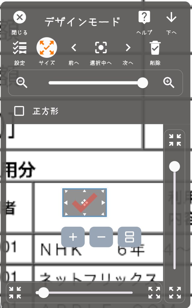 チェックマークのサイズ変更を行う場は、出来るだけズームイン(拡大)した状態の方がやりやすいです。チェックシート全体を見渡す場合は、ズームアウト(縮小)しましょう。