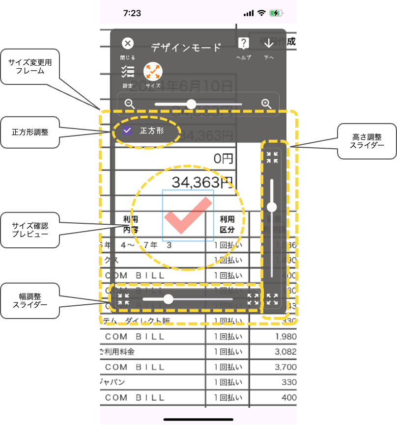 「サイズ変更フレーム」には、「サイズ確認プレビュー」、「高さ調整スライダー」、「幅調整スライダー」、「正方形調整」が含まれます。