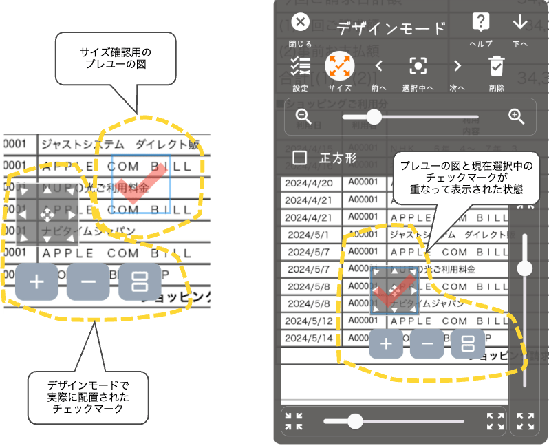 アイコン」などをタップすると操作対象(選択中)のチェックマークがサイズ変更フレームの中央になる様に画面の表示位置が移動します。結果、プレビューの図と実際に配置されているチェックマークが重なった状態で表示されます。