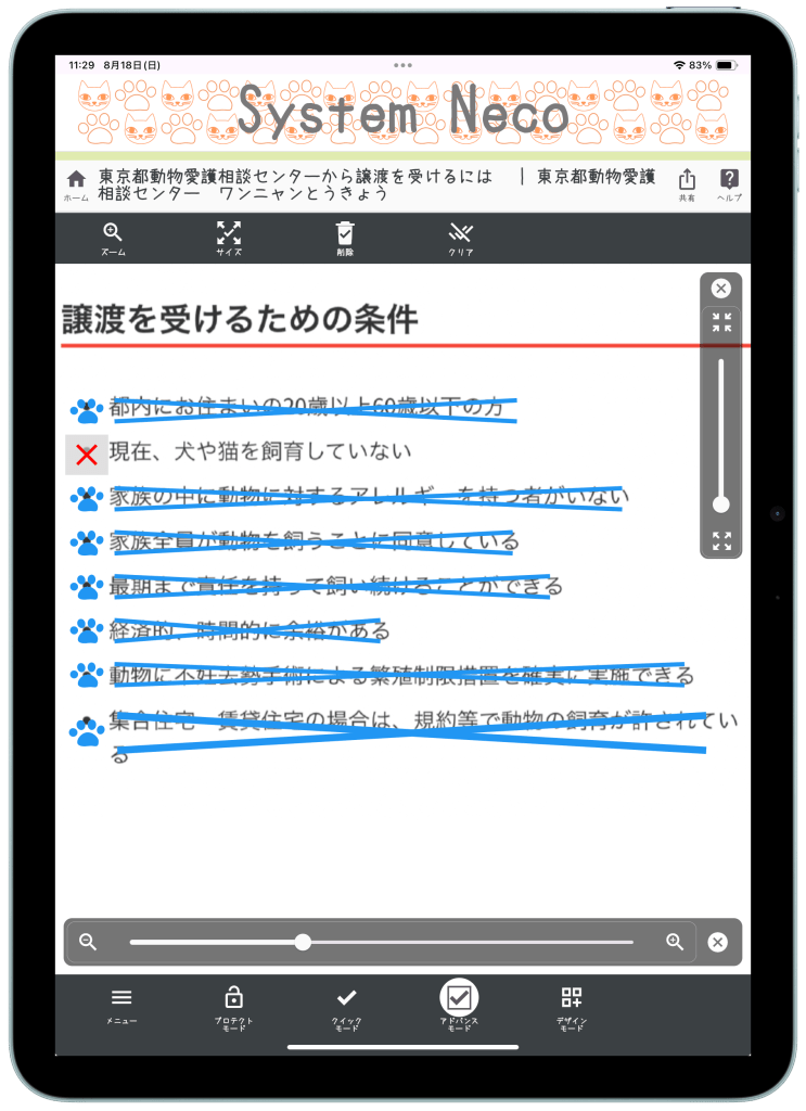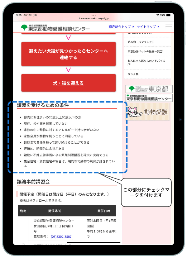 今回は、一例として「東京都動物愛護相談センター」のWebページ「東京都動物愛護相談センターから譲渡を受けるには」から「譲渡を受ける為の条件」にチェックマークを付ける方法を説明したいと思います。