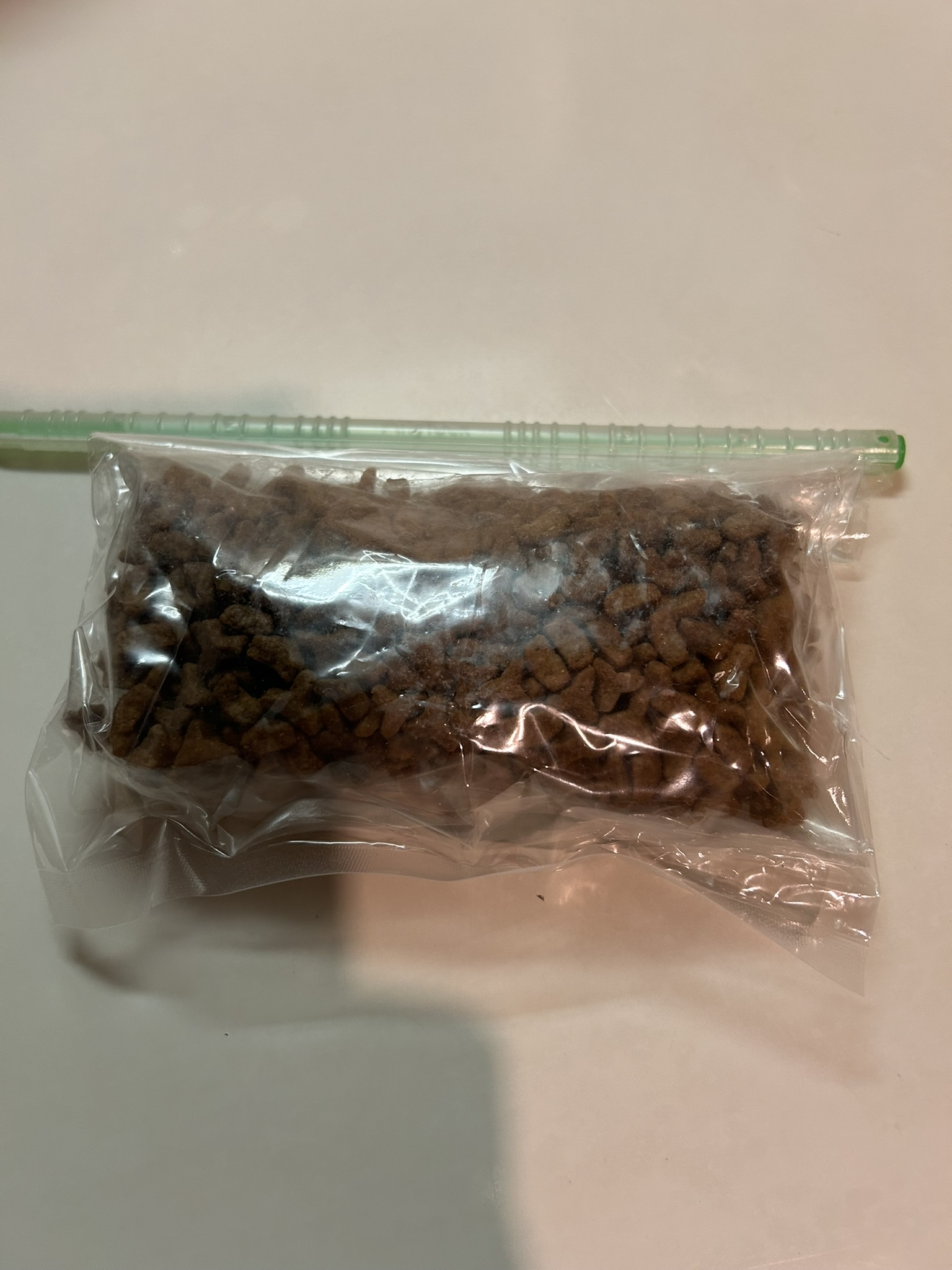 基本のカリカリです。Amazonの箱買いをジップロックのコンテナに入れる、入りきらない分は棒状のジップで留めています。