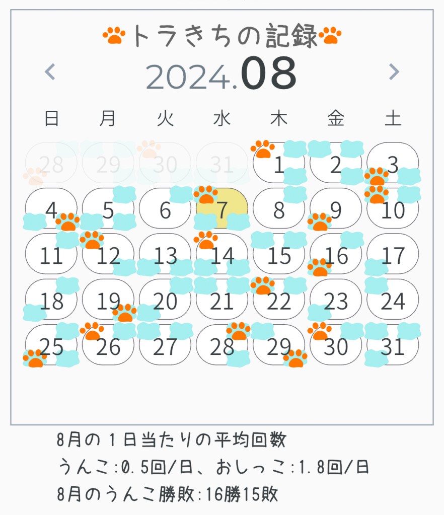 8月のうんこ回数は、心配するほど少なく、特に第3週目は3勝4敗、第4週目は2勝5敗という惨憺たる成績になってしまいました。3日あけてしまうことはなかったのですが、そうなるかもしれないととても心配しました。