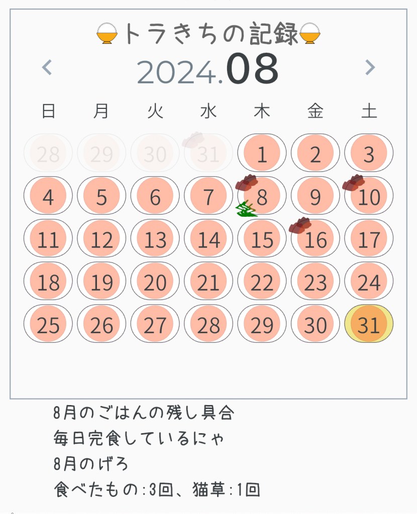 7月の3回のげろに続いて、8月もげろが3回ありました。第2週目にげろが2回、第3週目にげろが1回あり、この時は頻繁にげろしている感がありましたが、それ以降はげろもなく落ち着いています。