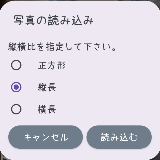 写真を読み込む際は、「縦横比」を「正方形」、「縦長」、「横長」から選択します。正方形なら横と縦の比率を1:1、縦長なら3:4、横長なら4:3の比率で写真の中心部分から切り取ります。切り取った画像は、それぞれ1200X1200、1200X1600、1200X900に縮小します。