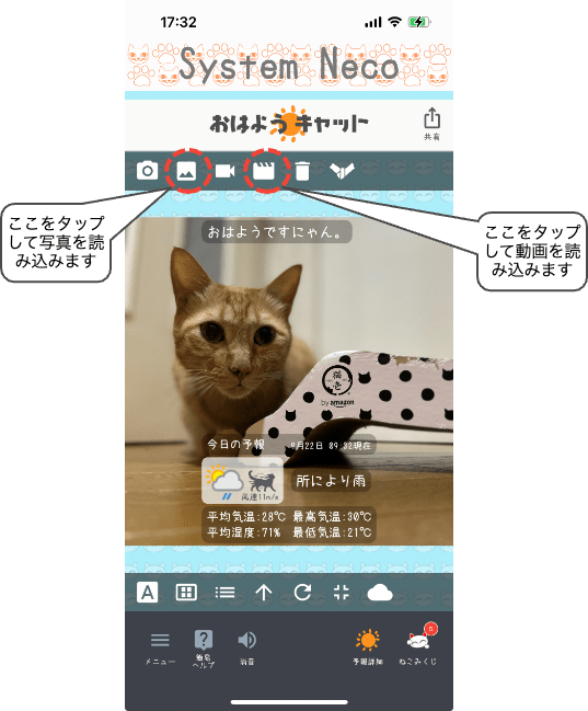 「おはようキャット」では、直接カメラを使って写真や動画を撮影することも出来ますが今回の説明では割愛させていただきます。