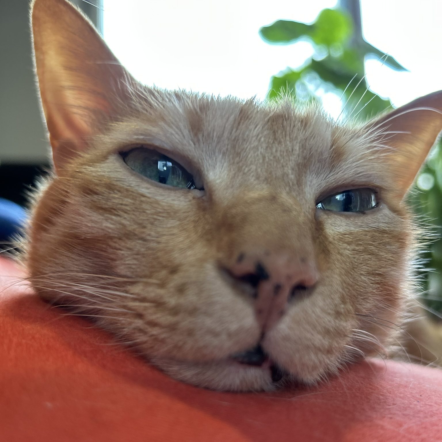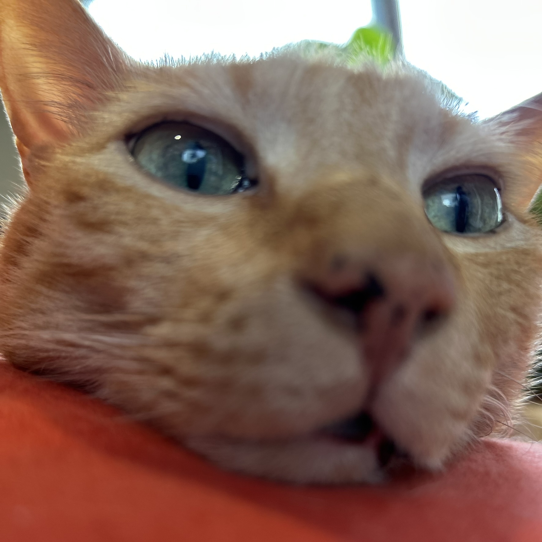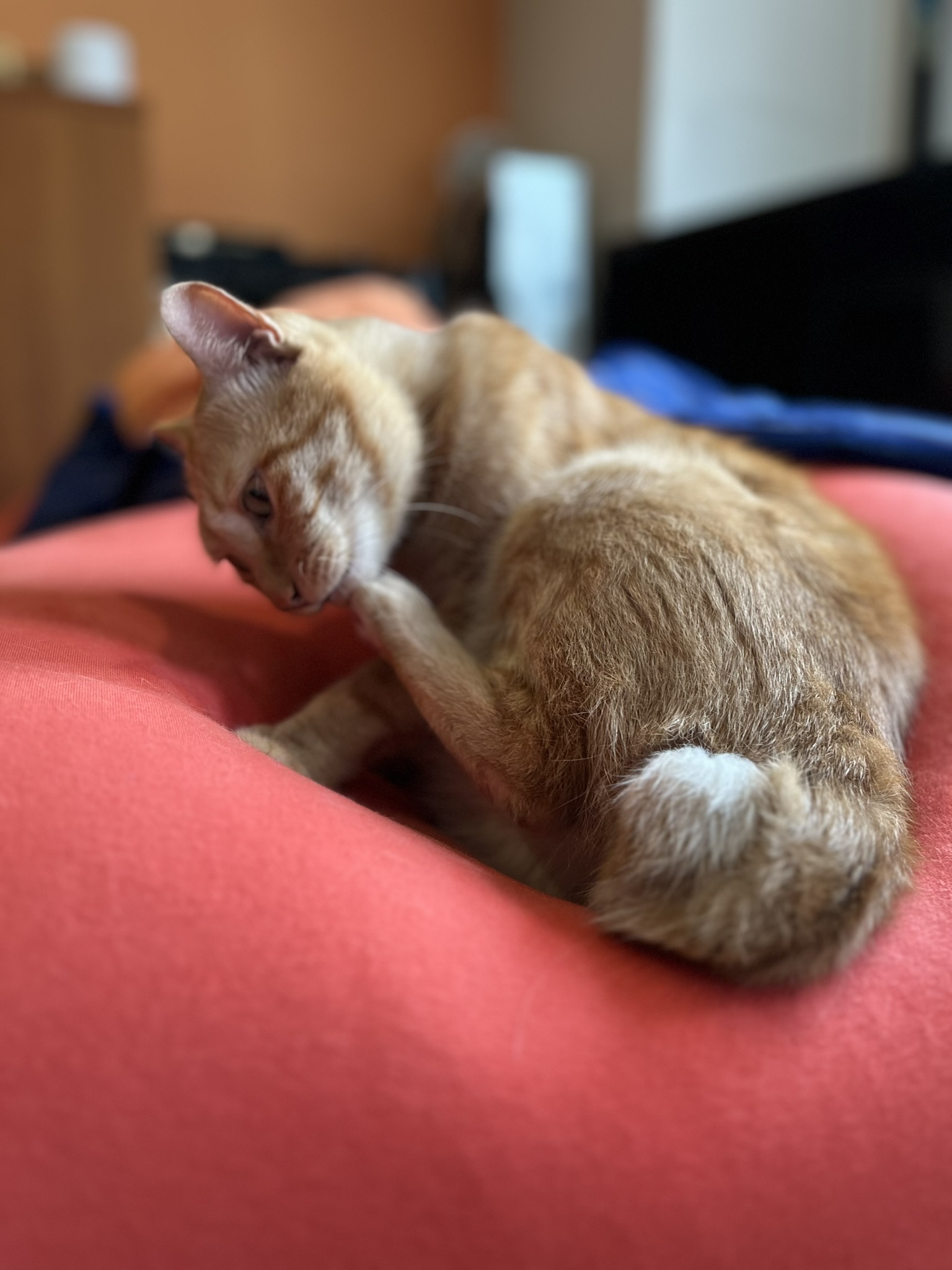 特にうれしい時には、しっぽを上げて振っているので、その色もあり、まるで柴犬さんみたいです。先代のチャイくんも同様にうれしい時はしっぽを上げてフリフリしていました。うちでは茶トラ柴犬説を唱えています。