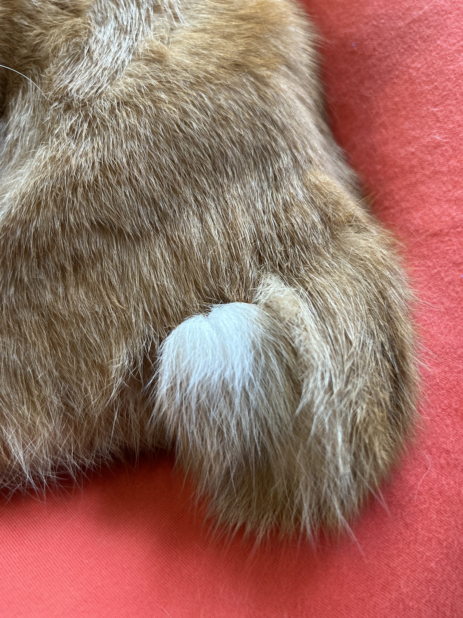トラきちの短いしっぽは、先端が白くなっています。渦巻状の先端が白いので、茶トラのトラきちのしっぽは、まるでシナモンロールみたいです。