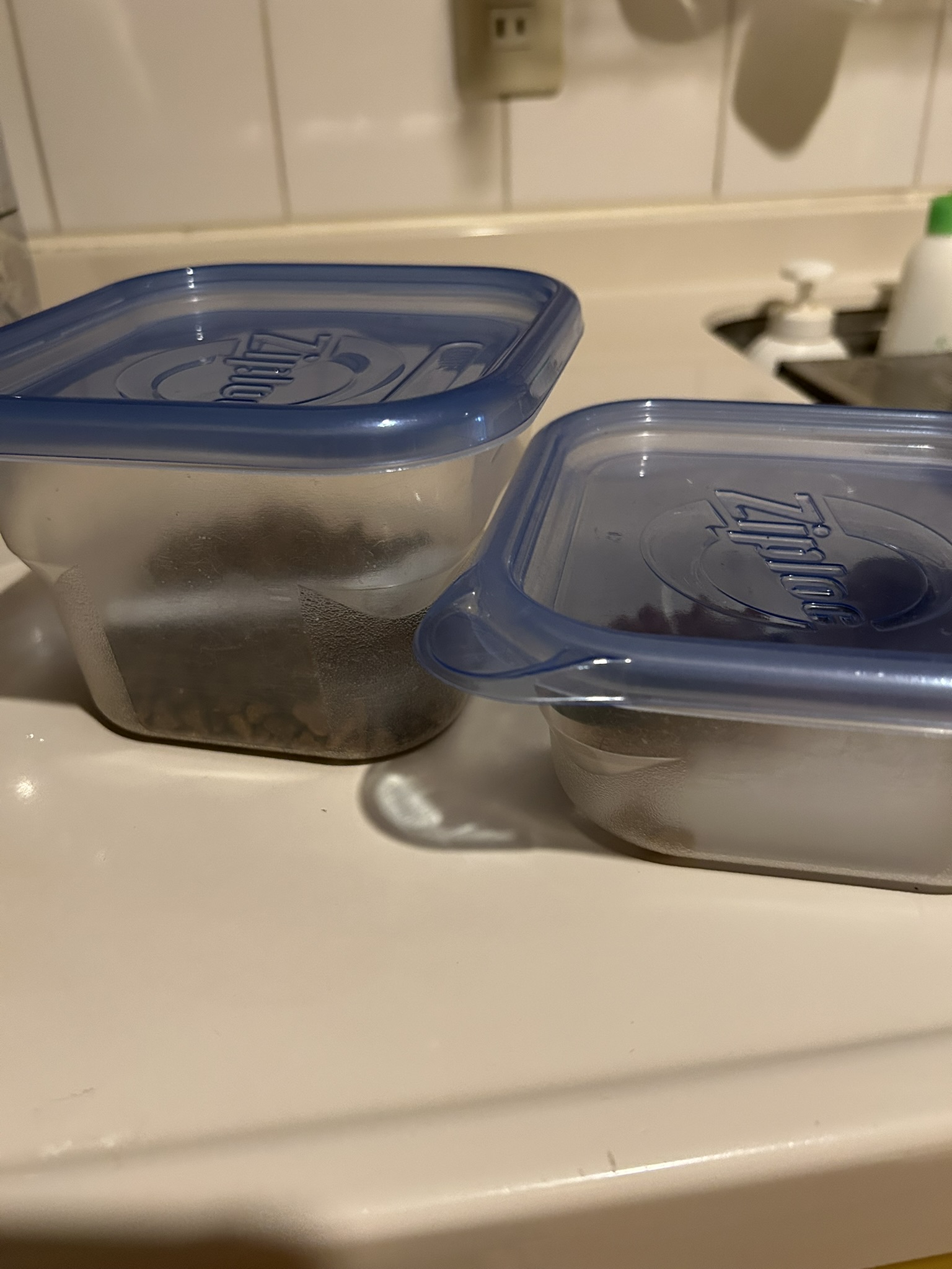 左側の写真は、コンテナに入れたカリカリで、左がピュリナワン右がロイヤルカナンです。右側は、先日購入したロイヤルカナンです。