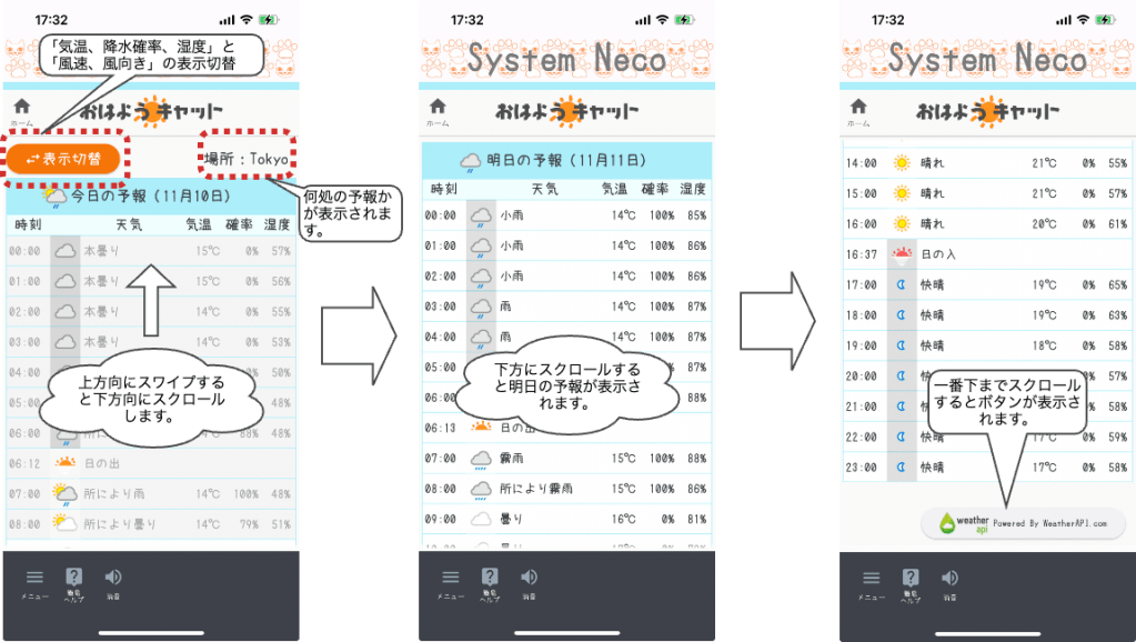 「おはようキャット」では、天気予報を表示しています。今回は、天気予報関連の解説をしたいと思います。
