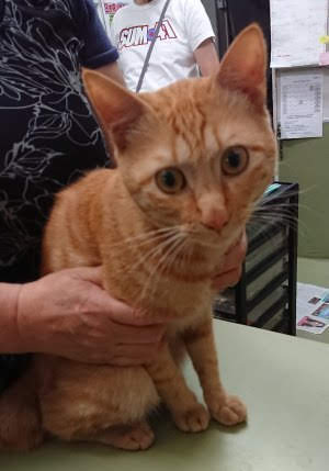 病院の診療室で待っていると、ケージから看護師さんに抱っこされてトラきちがやってきました。もともと飼われていた子なので、緊張はしているものの抱っこも撫でるのもさせてくれました。