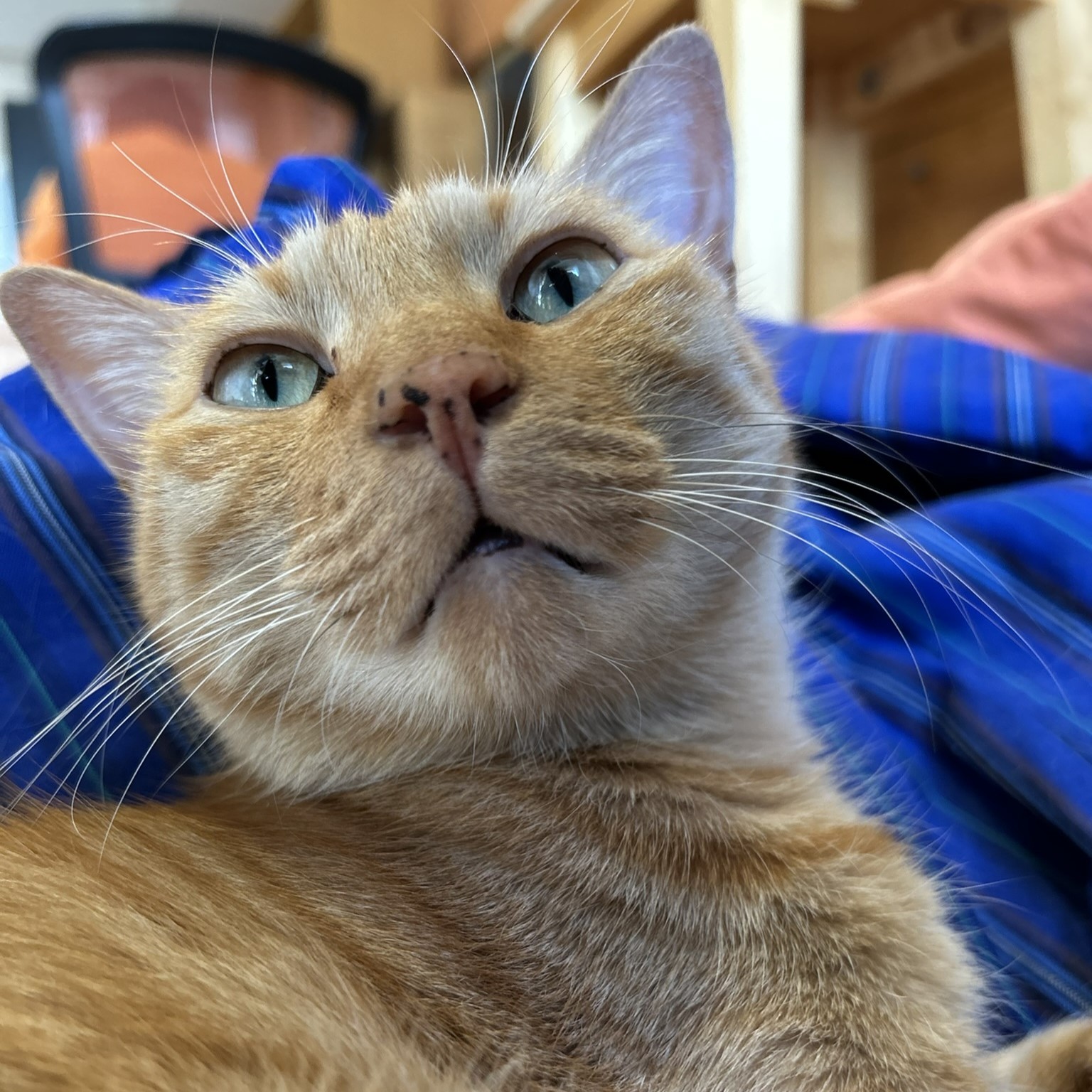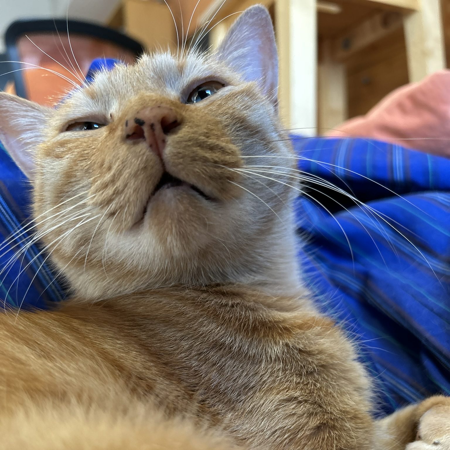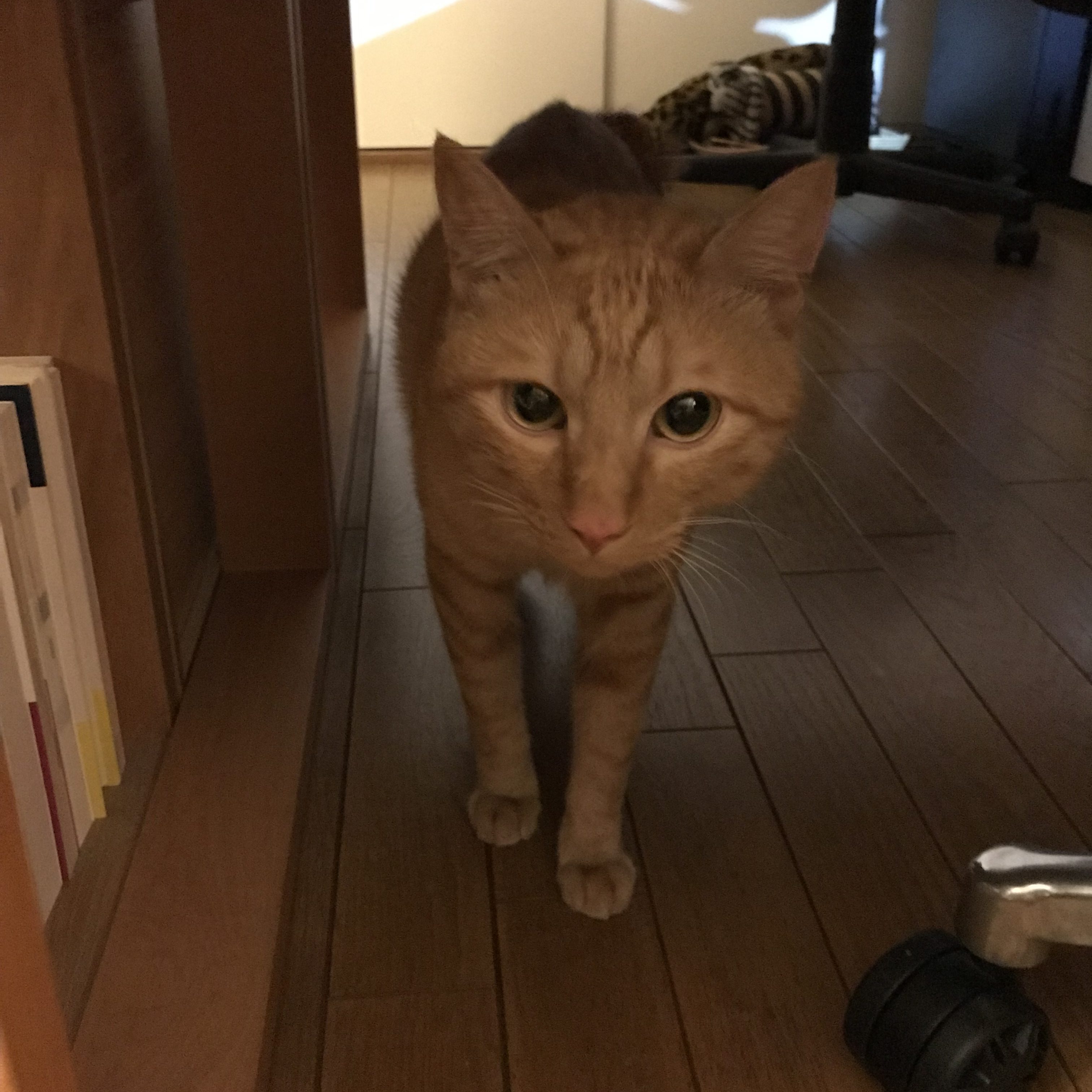 まずは、チャイくんと同じ茶トラであることでもうこちらは決まっていました。ただし、成猫から飼ったことはないため心配でしたが、会ってみてそれも大丈夫そうだし、しっぽがチャイくんと同じ短いくるりんしっぽでした。その場でうちに来ることを決めました。