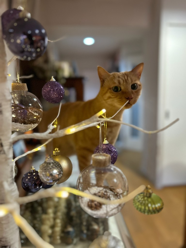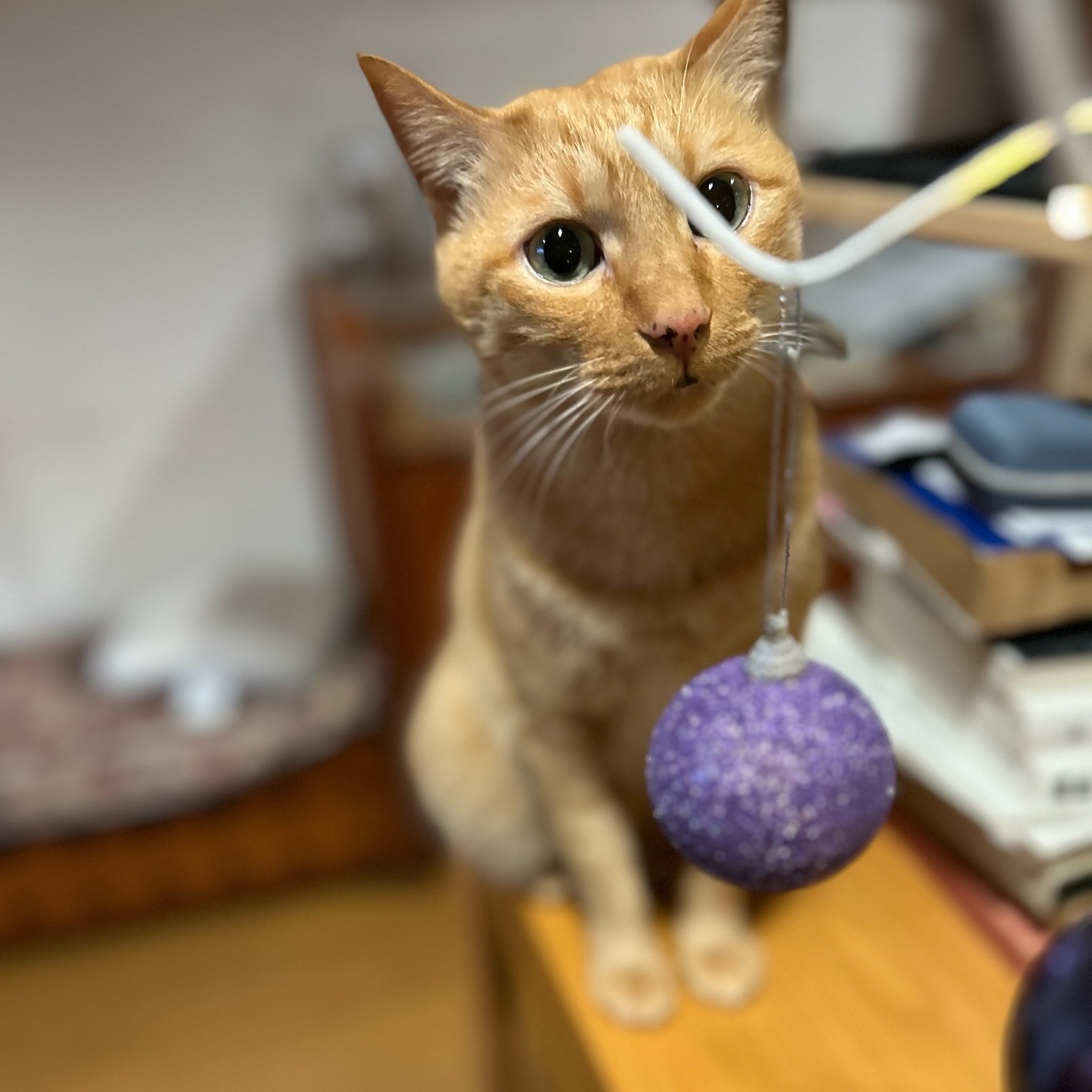 オーナメントはおもちゃで使っているボールによく似ているし、キラキラしててゆらゆら動いています。トラきちも興味シンシンです。