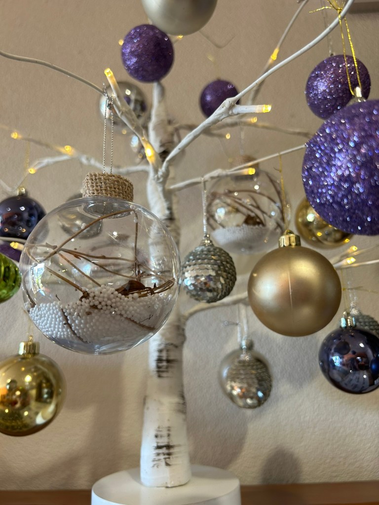 今年は、透明で中に小さな松ぼっくりと雪(?)が入っている大きなオーナメントを4つつけました。これがこのツリーによく合って他の紫やシルバーのオーナメントもよく引き立ちます。昨年は、この大きな透明のオーナメントはなく大分印象が変わったと思います。
