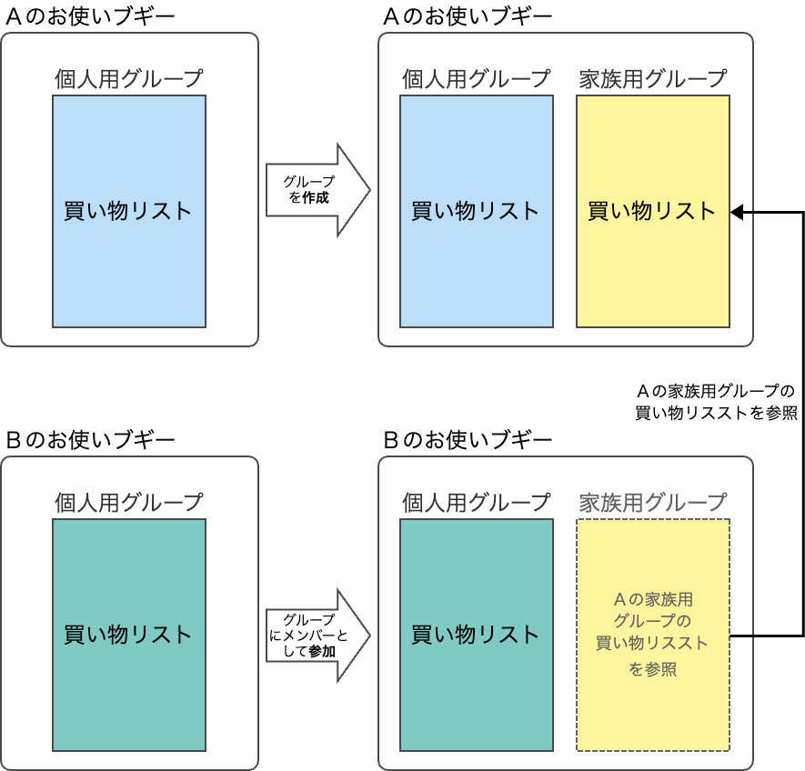 グループを作成しなければ、Aさんは「Aさんの買い物リスト(個人用グループ)」、Bさんは「Bさんの買い物リスト(個人用グループ)」を使い続けることになり、お互いに買い物リストを共有する事は出来ません。