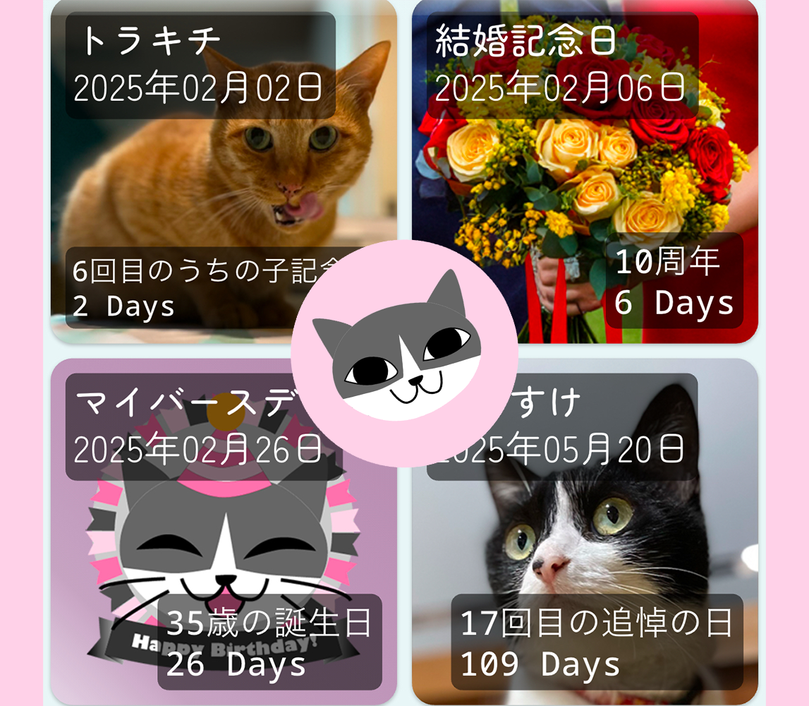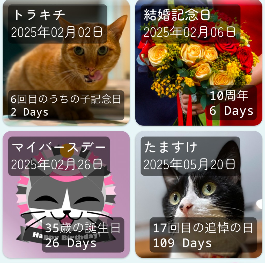 「にゃんデイタイマー」は、イベントに意味を持たせています。イベント毎にカウントダウンする内容が異なります。