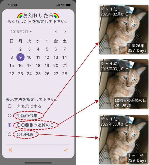 「〇〇回目の追悼の日」を指定すると、毎年お別れした日を基準にその年数が表示されます。