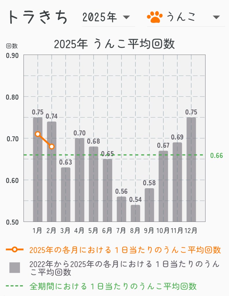 そこで、【おげんこキャット】で、年間統計が出るので見てみると、3例年3月はうんこ回数が減少する傾向があることが分かりました。しかし、今年は冬が長かった影響もあるのか(むしろ安定していた?)、3月22日現在で1日平均0.7回という例年にない好成績を示しています。