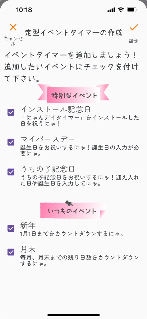 アイコンをタップすると簡易ヘルプが表示されますが、こちらのヘルプは全画面表示されます。こちらのヘルプを一読してもらえればにゃんデイタイマーの全体像を把握出来るかと思います。