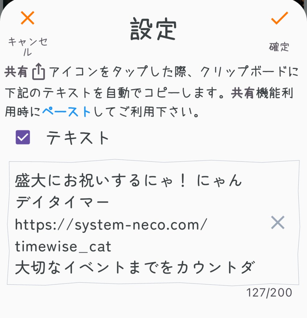 テキストの左側にあるチェックボックスにチェックを入れるとテキスト入力出来る様になります。定型文としてテキストを入力しておけば、メッセージカードを共有機能でSNSにアップロードする際に、ペースト出来る様になります。