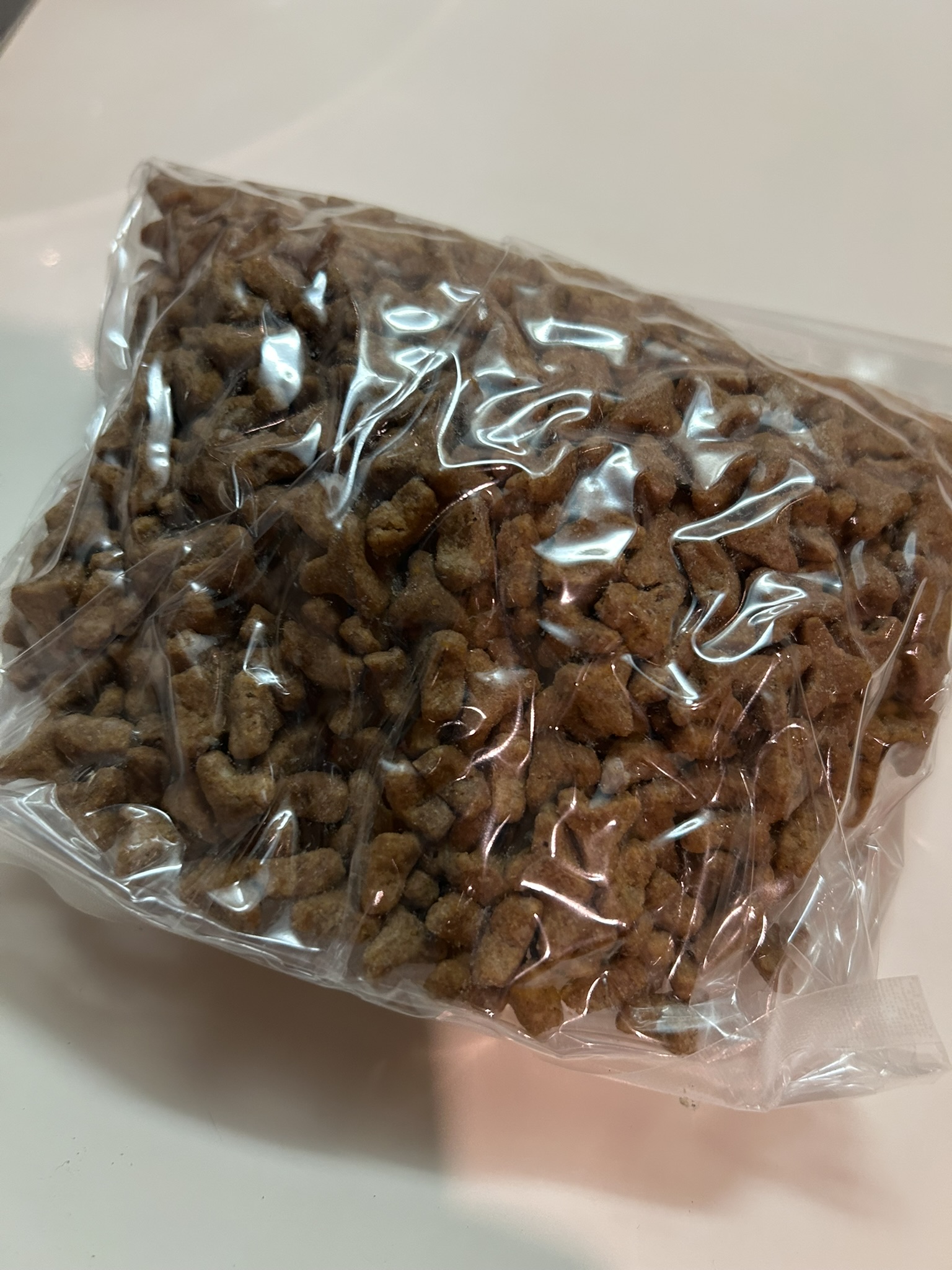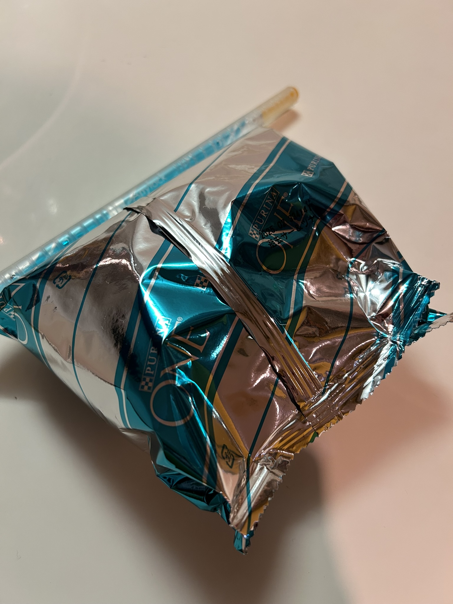 ピュリナワンのように小袋には分かれていないので、小分けにして真空パックにして保存しています。さらにジップロックコンテナに入れています。