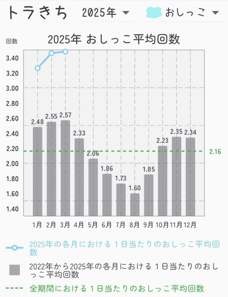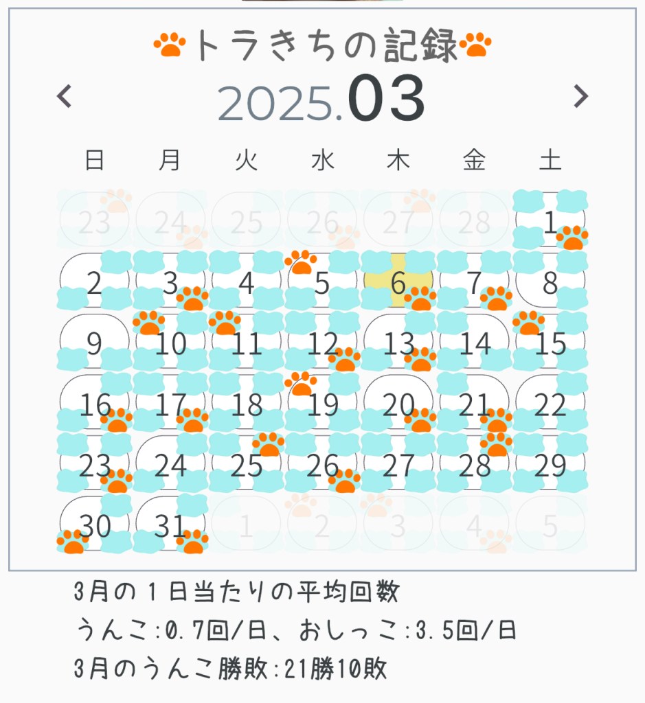 トラきちの3月のうんこ・おしっこ状況を振り返っています。例年、3月のうんこ成績は落ち込みますが、今年のうんこ成績はどうだったのでしょうか。