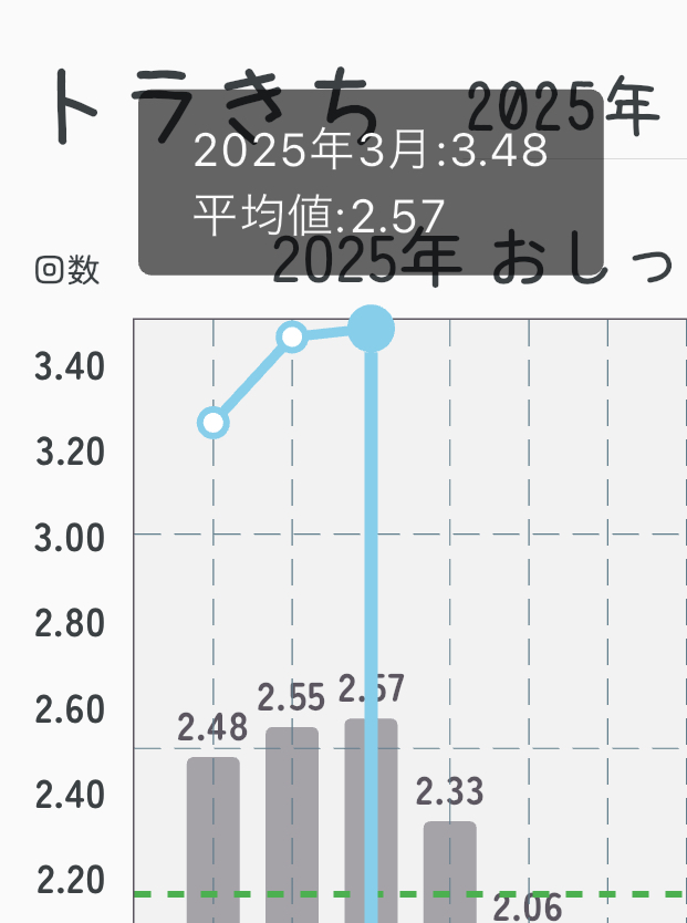 左側は、3月の〇を長押しした時の拡大図となります。小数点第二までだと、3.48回となりました。