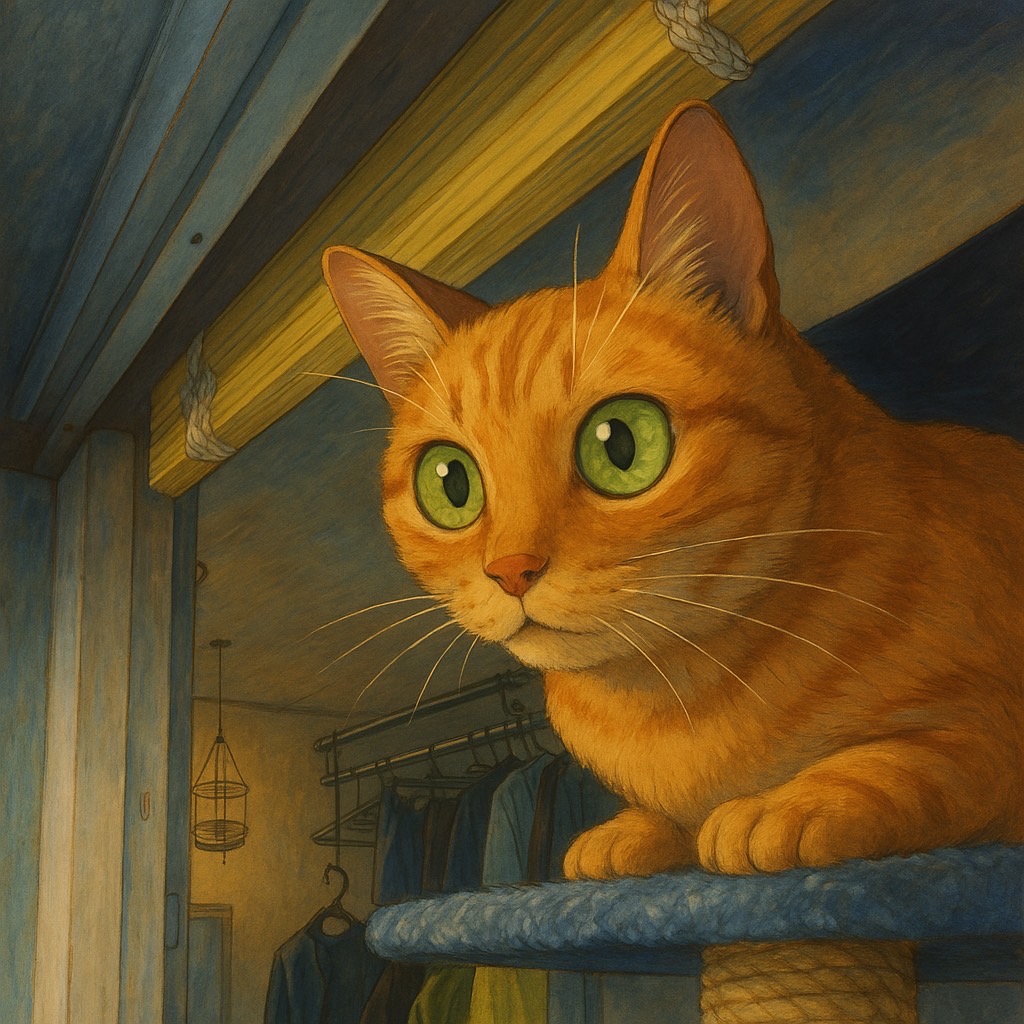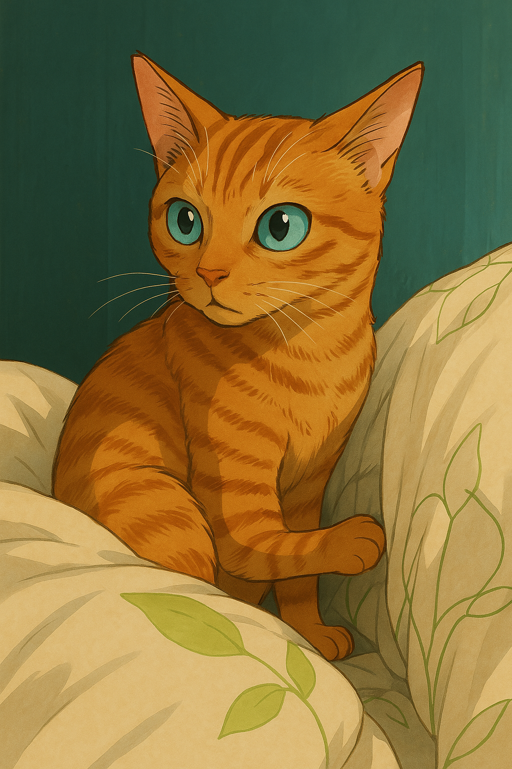 ChatGPTにまずはジブリアニメ風の画像作成をお願いしてみましら、色合いやタッチなどが柔らかいジブリ風の画像になりました。背景も少し魔法使いの家風に見えますね。トラきちの目もきれいな緑色でしっかり見開いています。何かを発見して、これから冒険の旅に出るところなんでしょうか。