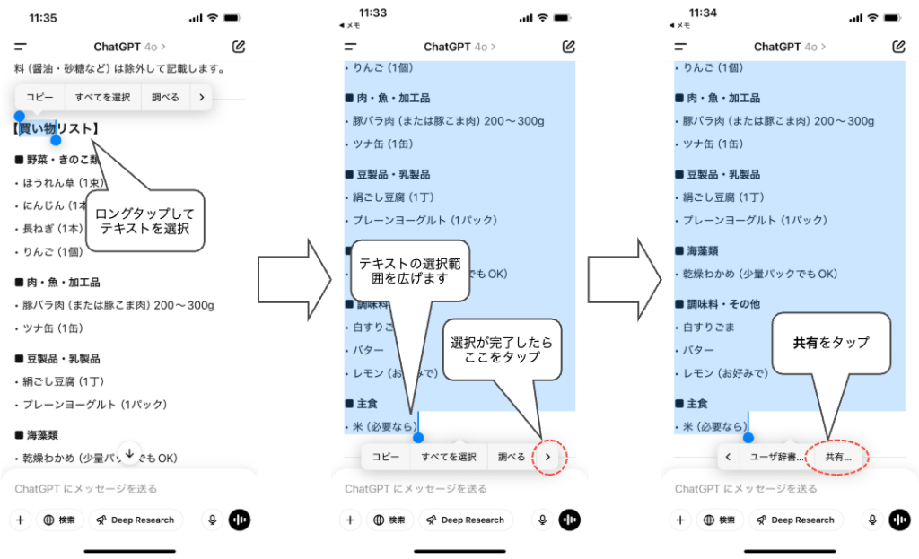 ChatGPTの画面をロングタップ(長押し)すると、長押しした部分のテキストが選択状態になります。買い物リストの文字を全部選択します。選択したテキストを共有します。