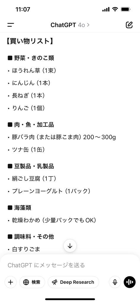 「必要な物を買い物リストにまとめて!」とお願いしました。結果はこんな感じです。