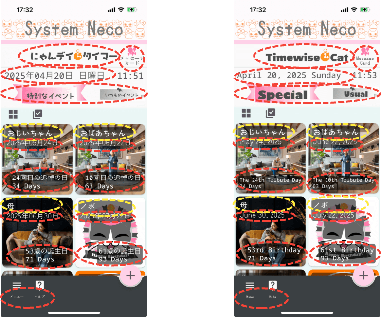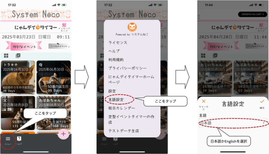 「にゃんデイタイマー」は、日本語と英語表記に対応しています。