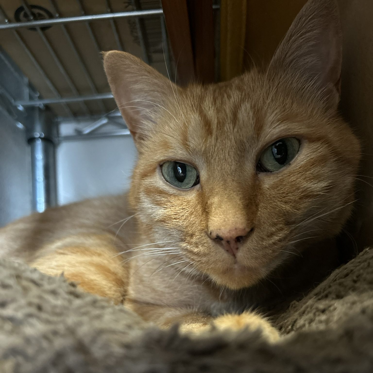 家の中で、トラきちの好きな場所は何か所かあるのですが、最近多いのはスチール棚の一番下のトラきちがぴったり入る狭いスペースです。