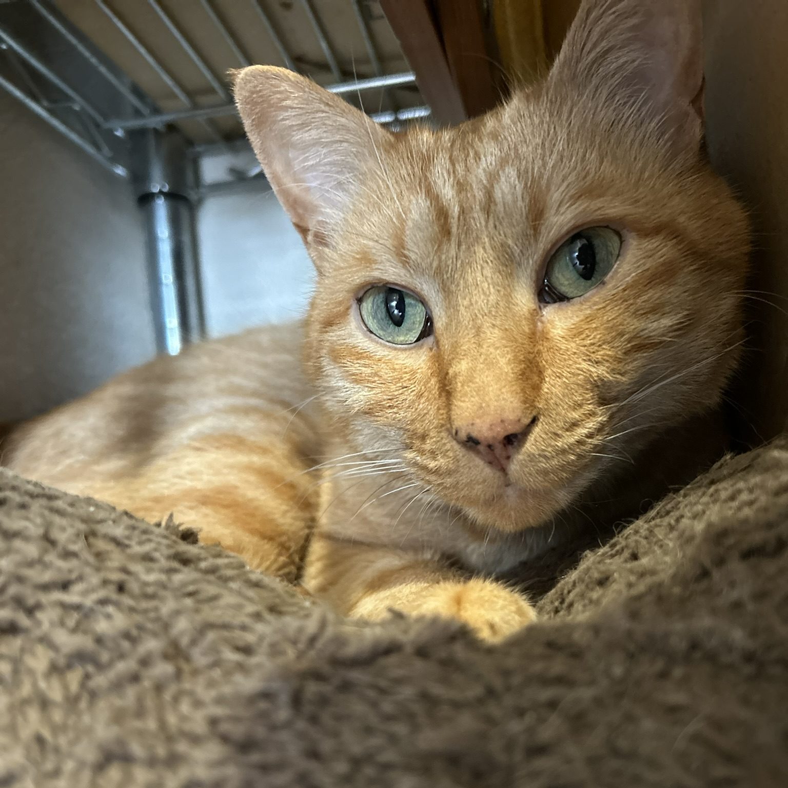 スチール棚の一番下ですが、箱がおいてあるところがこのスペースです。この箱の上にクッションをおいて暖かさと柔らかさをキープしています。