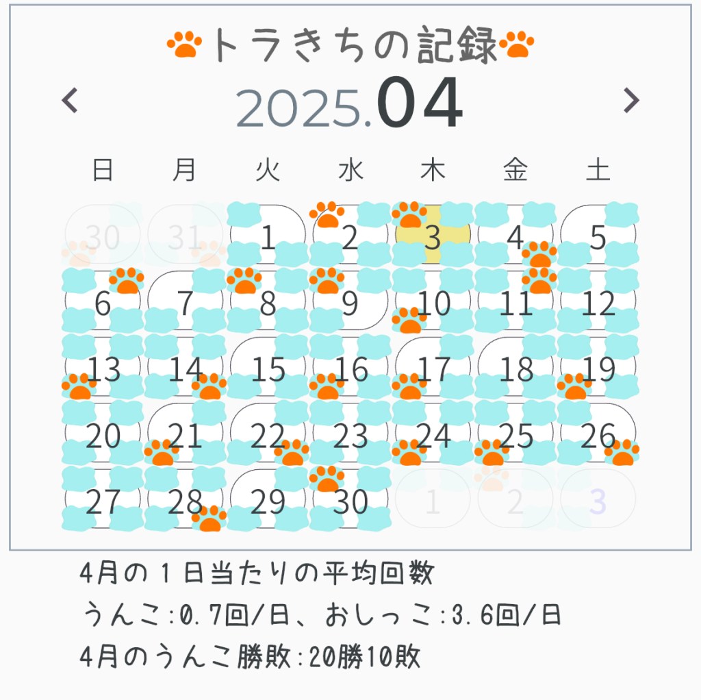 トラきちの4月のうんこ・おしっこ状況です。4月の成績もまあまあ良い感じとなりました。