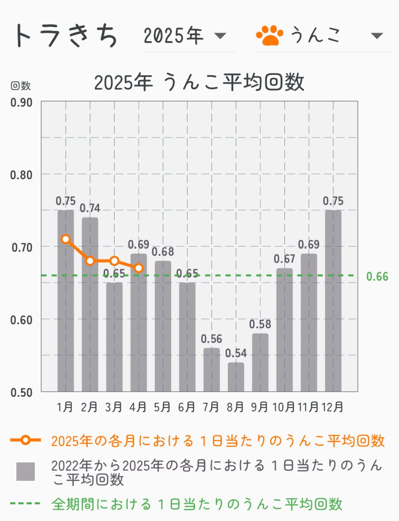 【おげんこキャット】の統計で例年の状況と比較をしてみますと、今年の4月は、例年よりは下になるものの、平均の0.66回/日より上回っています。例年、夏に向けてうんこ回数は下がってくる傾向にあるため、この点は5月も引き続き気を付ける必要がありそうです。
