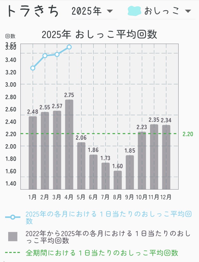 おしっこの回数は3月よりもさらに上がっています。暑くなってくる5月は下がる傾向にあるようですが、例年4月は増える傾向にあるようです。