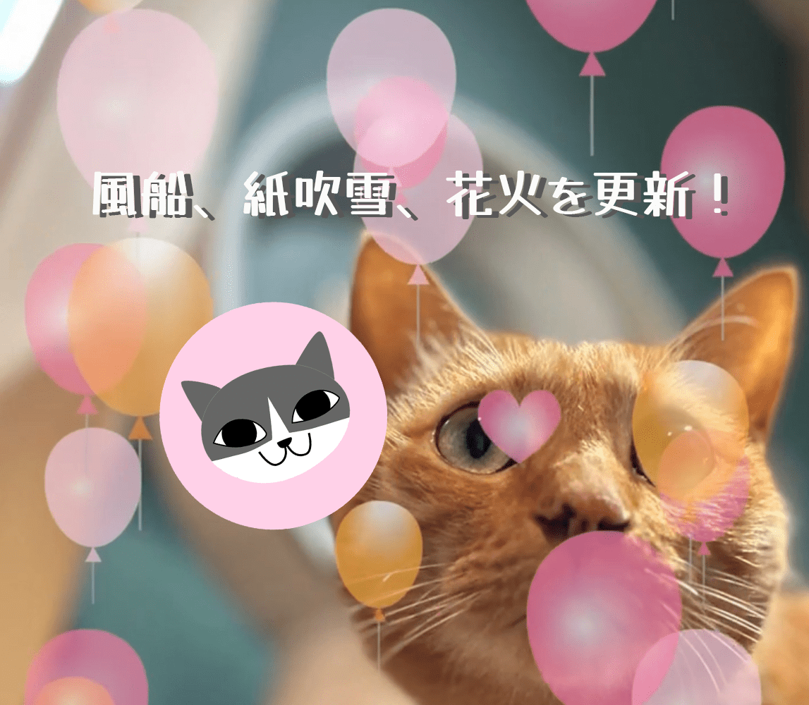 「にゃんデイタイマー」の風船、紙吹雪、花火のアニメーションを更新しました。アプリはバージョンアップはしていません。メッセージカードの作成で、風船、紙吹雪、花火を選択すれば新しアニメーションがダウンロードされます。