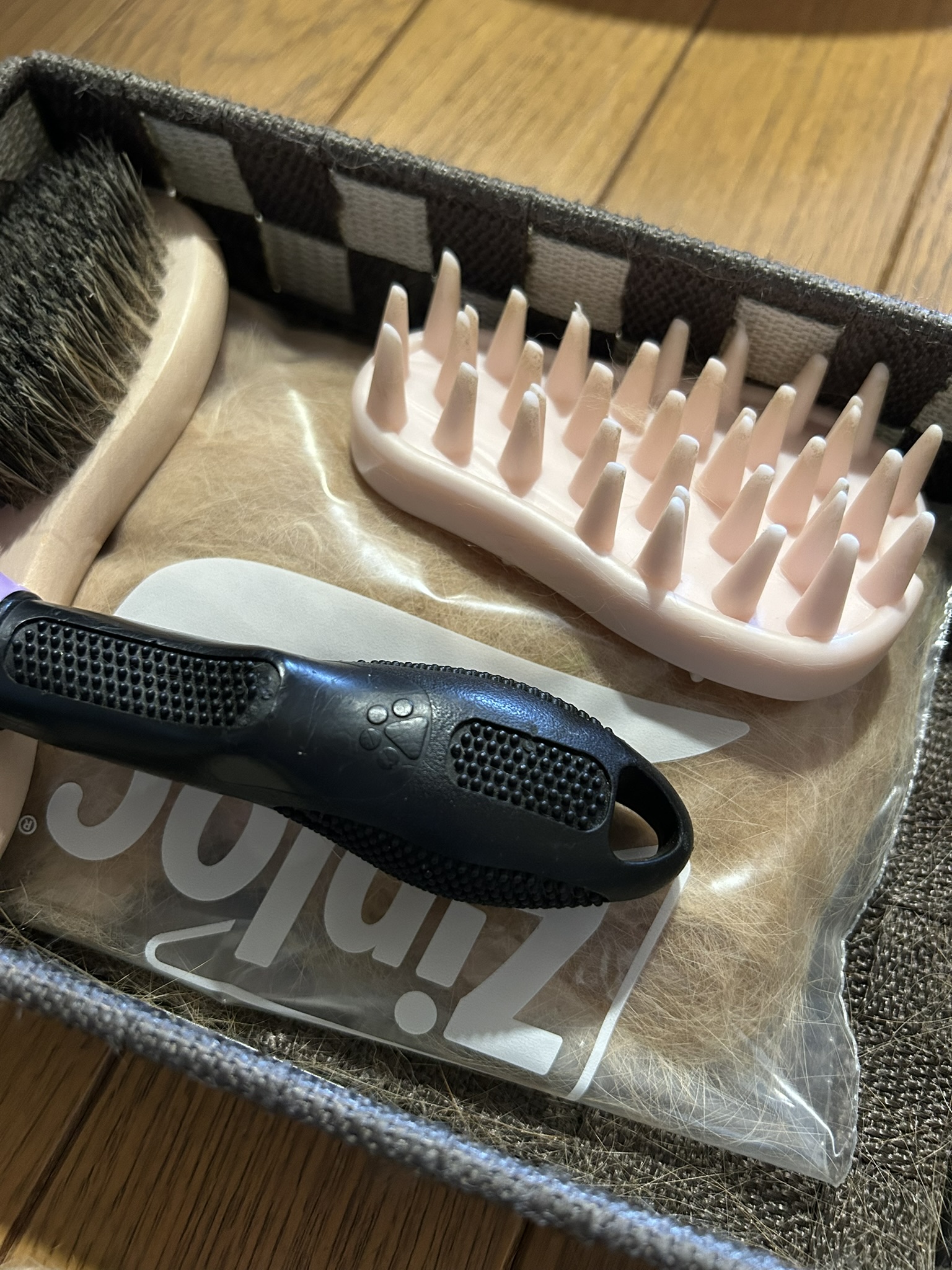 ブラッシングで使っているブラシとジップロックに入れた抜け毛