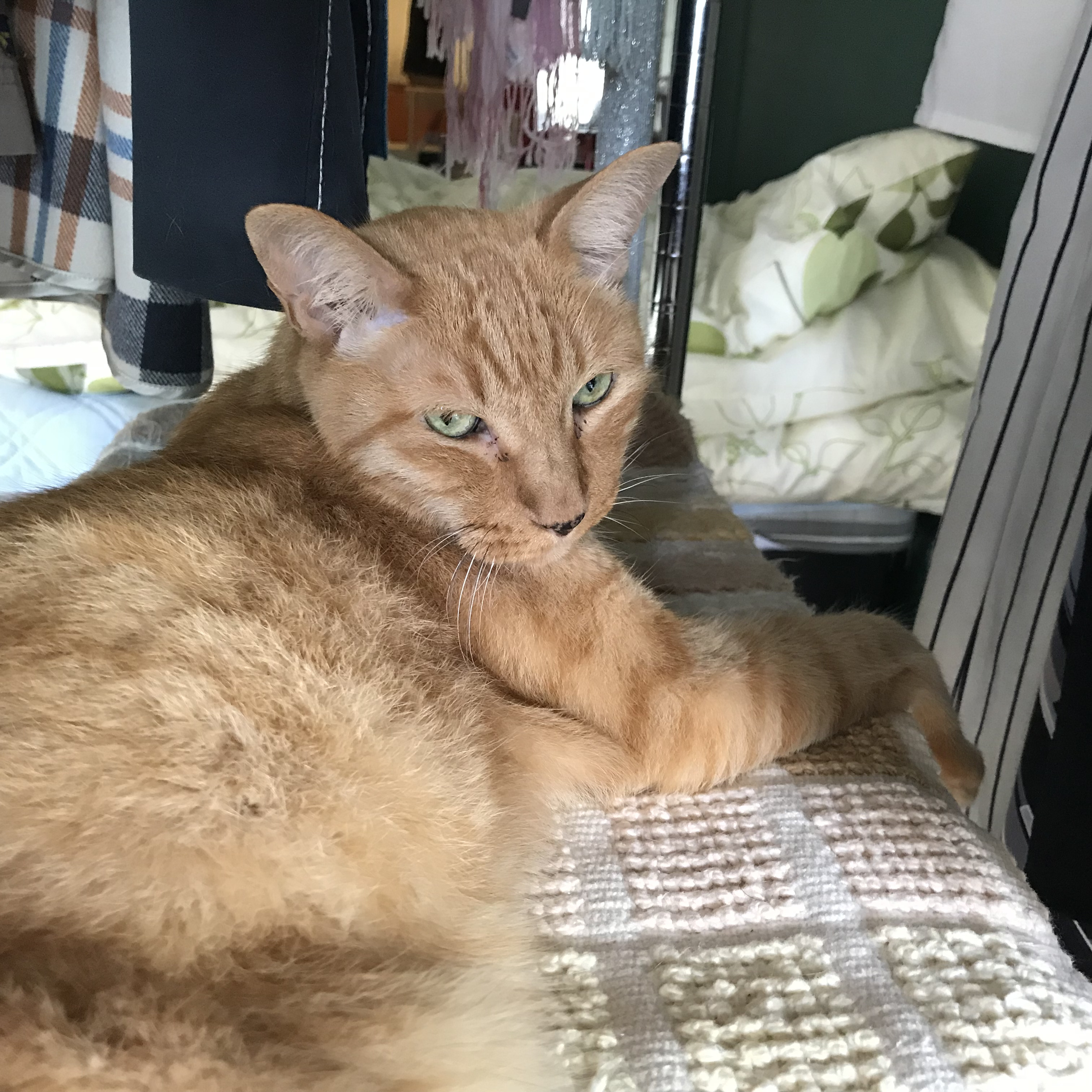 この猛暑ですから、人間が出かけるときにもエアコンは切らないで出かけていますし、いくらエアコンが嫌いだからと言って冷房なしではトラきちも熱中症を起こしてしまいます。ただし、暖房の場合とは違って、エアコンの風の当たるヨギボーの上を避けて、ひんやりパッドの上や隣の部屋のベッドの上、エアコンの風が直接当たらない棚の陰にあるトラきちのベッドの上にいます。