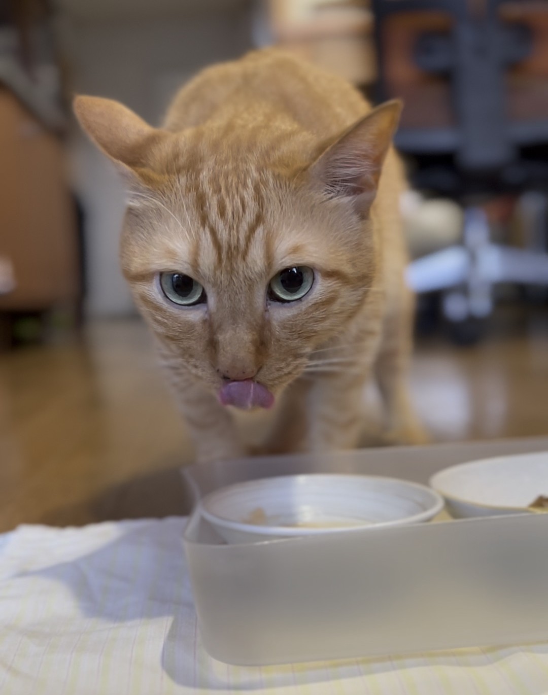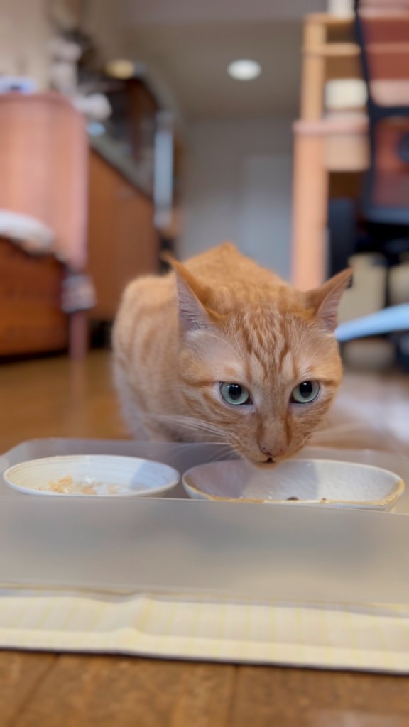 基本のごはんは、カリカリです。そして、1日に1袋のパウチを薄めてスープにしたものを食べています。後はご褒美のシーバと夜のちゅ~るを毎日食べています。