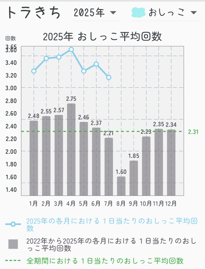 おしっこの回数は6月よりは減っていますが、例年よりもかなり良くなっています。これはご褒美制(おしっこしたらシーバ2粒)のおかげだと思います。トラきちは、おやつをもらいたいがために、トイレにいくこともあります(笑)。