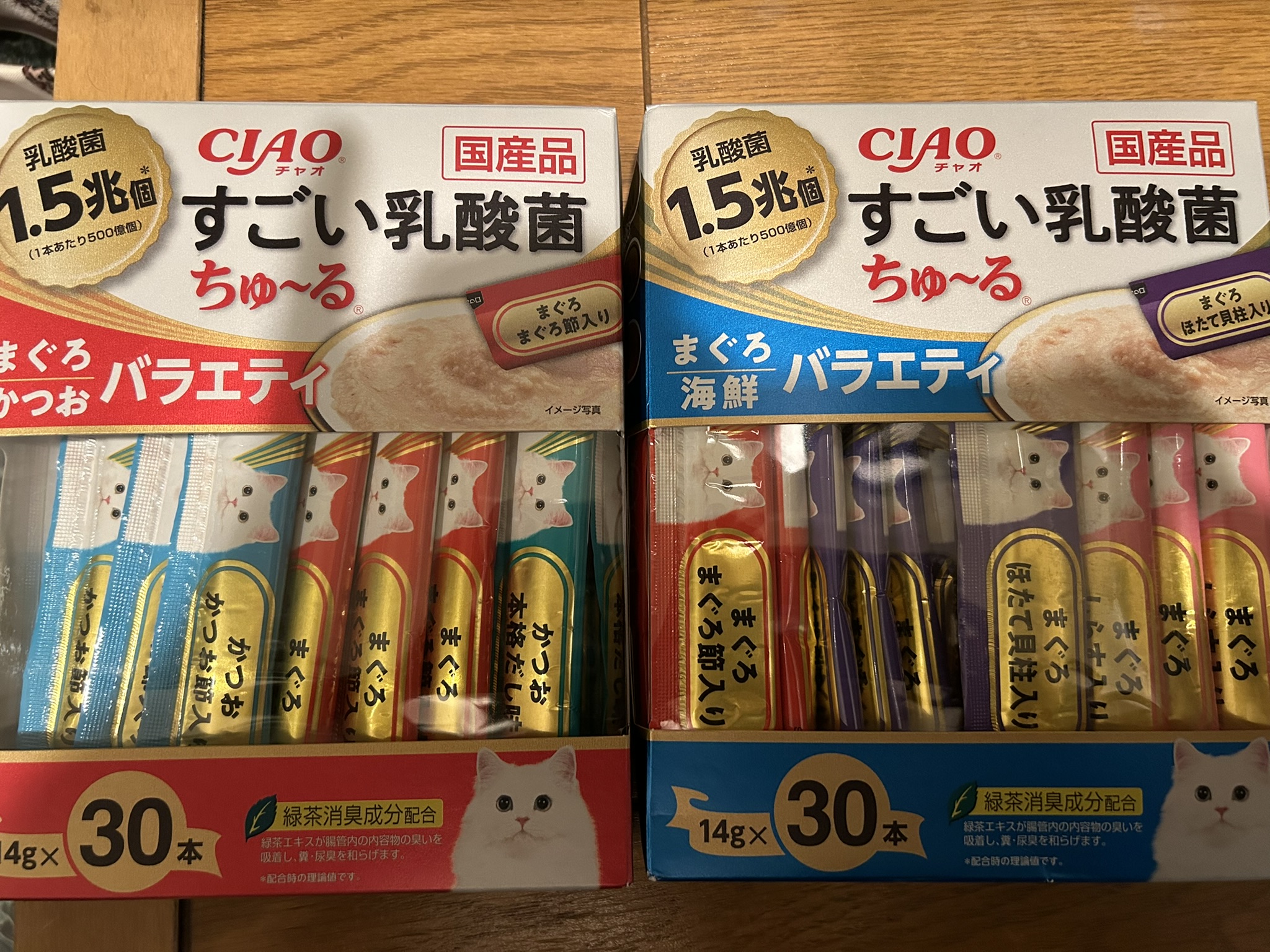 毎晩のちゅ~るはトラきちの晩酌です。ご褒美のシーバもがんばっていい子にしてもらっています。