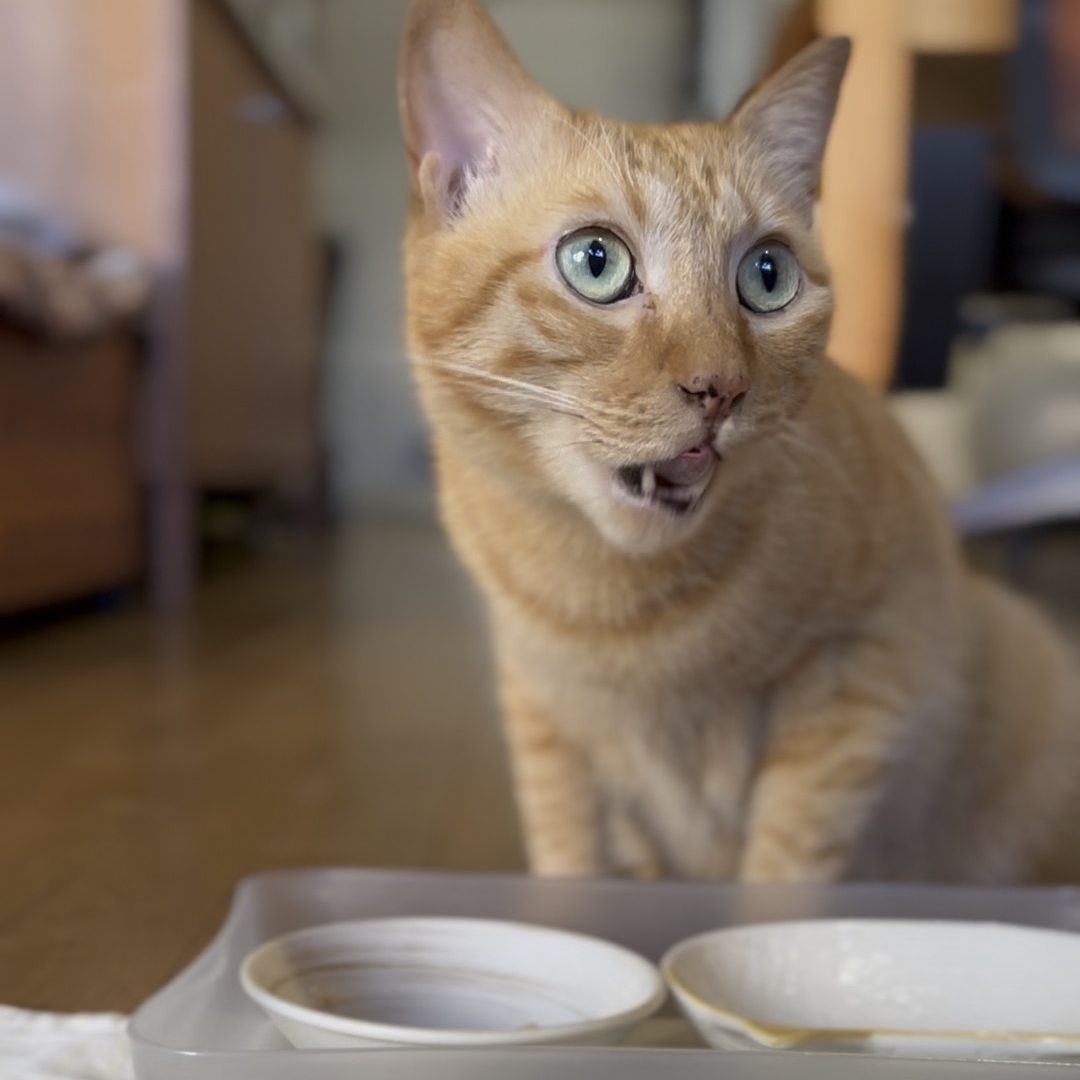 基本のごはんは、カリカリです。そして、1日に1袋のパウチを薄めてスープにしたものを食べています。後はご褒美のシーバと夜のちゅ~るを毎日食べています。